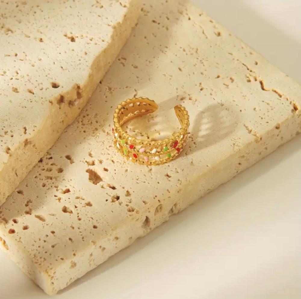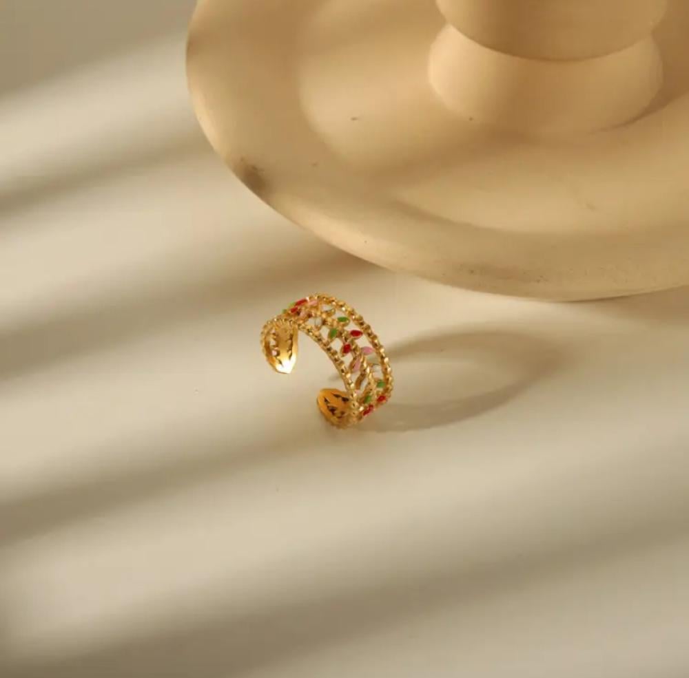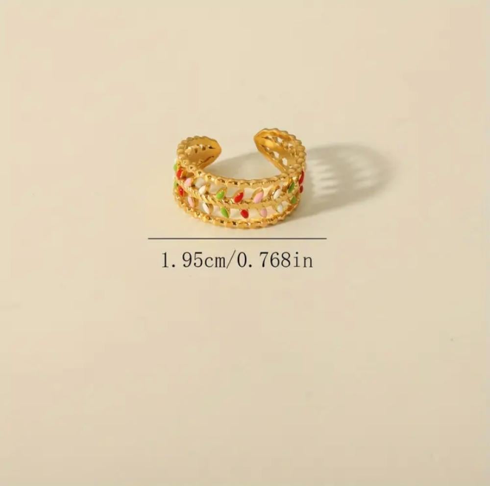 خاتم مفتوح على شكل ورقة من الفولاذ المقاوم للصدأ مزين بالخرز الملون لا يبهت أسلوب فاخرللارتداء اليومي